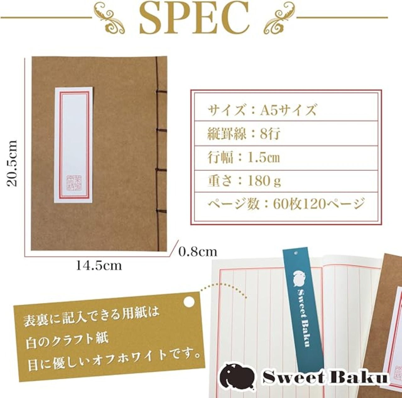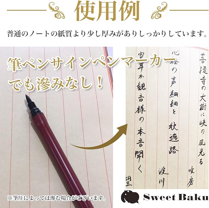 ページ紙は目に優しいオフホワイトで自然な風合いです。和綴じですが袋になっておりません。普通のノートより少し厚めの用紙です。筆ペンサインペンマーカーでは裏滲みしません。(注意 筆圧やペンの種類では滲む可能性があります。マジックは裏映りします。)