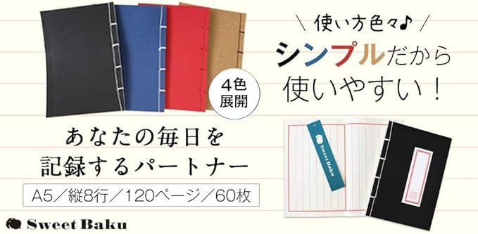 A5サイズ 60枚 120ページ 8行の縦罫線入り、赤 青 黒 ベージュ の4色がございます。