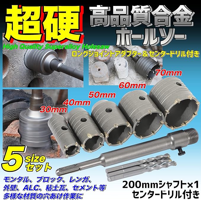【5サイズ コンクリートドリルセット】直径30~70mm 5サイズ(30mm 40mm 50mm 60mm 70mm)、20cmシャフト、センタードリル付き。