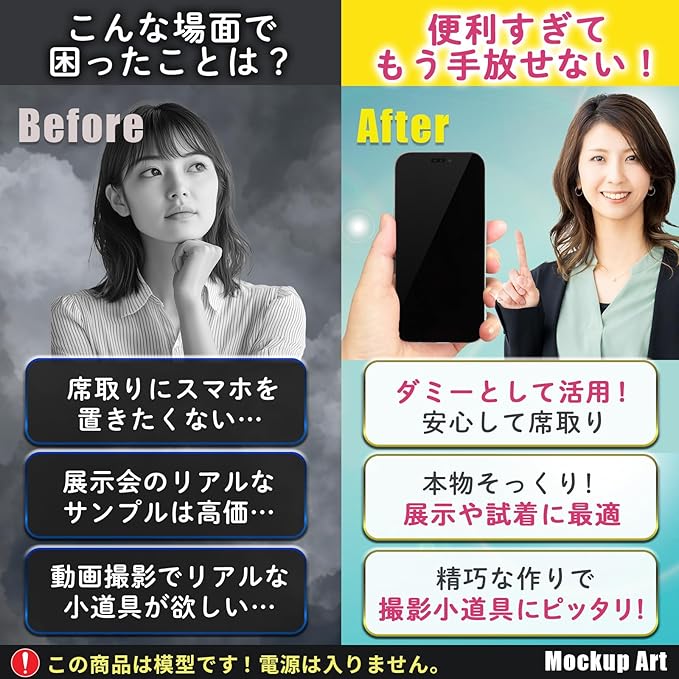 【動作しない模型だからこその安心感|展示・撮影の小道具に】展示・撮影・フィッティング確認などのほか、SNS投稿用の撮影小道具や、カフェや公共スペースでの“席取りアイテム”としても活躍。リアルでありながら気兼ねなく使えるのがモックアップの魅力です。*スマホとしての通信・通話・タッチ操作・カメラなどの機能は一切搭載されていません。