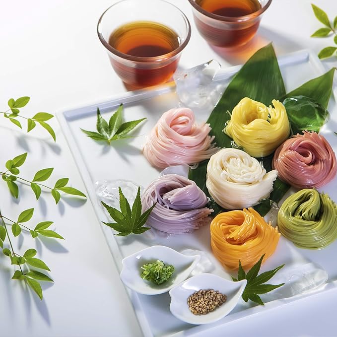 同じお鍋に各色麺を少しづつまぜて茹でても綺麗な冷やし素麺をお楽しみいただけます。