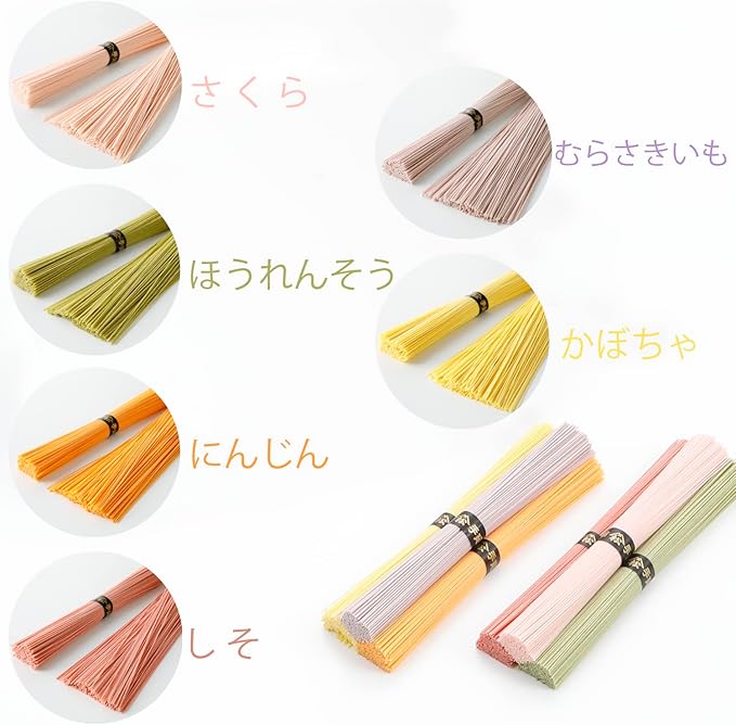 白麺 12束 むらさきいも、さくら、しそ、ほうれんそう、かぼちゃ、にんじん 各50g 4束 合計36束