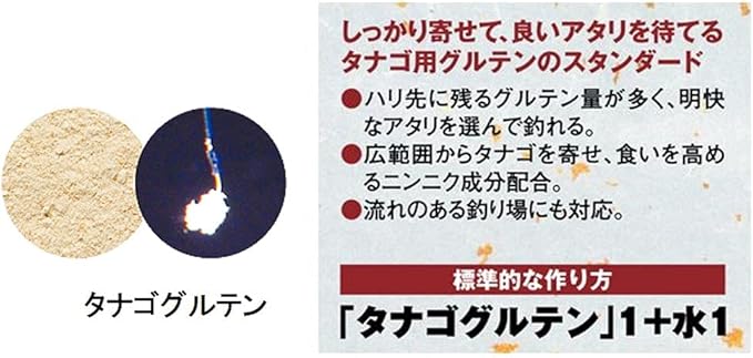 ■タナゴグルテン⇒止水域から流れのある釣り場まで、様々なシーンに幅広く対応するスタンダードなタナゴ専用グルテンエサ。ハリ先に残るグルテン量が多いため、明快なアタリを選んで釣ることが可能。また、ニンニク成分も配合し、広範囲からタナゴを寄せ、食いを高める効果が期待できます。 ■黄身練り⇒タナゴ釣り用のくわせエサです。水を加えて練るだけで、本格的な黄身練りが簡単に作れます。練り込むほどにネバリが強くなり、ハリ持ちが良く、流れのある釣場に最適です。できあがりは鮮やかな黄身色、卵黄配合で食い込みも抜群です。