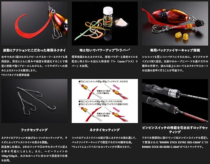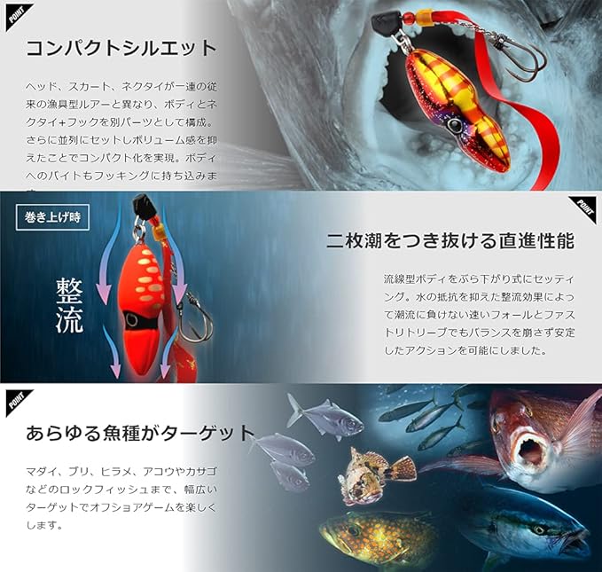 ヘッド、スカート、ネクタイが一連の従来の漁具型ルアーと異なり、ボディとネクタイ+フックを別パーツとして構成。さらに並列にセットしボリューム感を抑えたことでコンパクト化を実現。ボディへのバイトもフッキングに持ち込みます。流線型ボディをぶら下がり式にセッティング。水の抵抗を抑えた整流効果によって潮流に負けない速いフォールとファストリトリーブでもバランスを崩さず安定したアクションを可能にしました。マダイ、ブリ、ヒラメ、アコウやカサゴなどのロックフィッシュまで、幅広いターゲットでオフショアゲームを楽しくします。