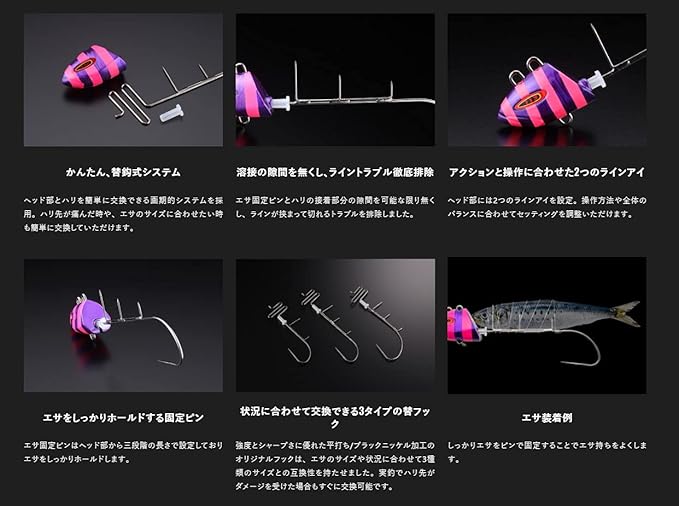 様々な状況に即対応。即替えシステムで一発交換! ヘッドの重さやカラー、フック形状を簡単に交換可能。さらに、20号から60号まですべてての重さのヘッドに対し同じフックを装着できる設計。水深や潮の速さ、濁り具合や天気、さらには太刀魚の活性や狙うサイズ、餌のサイズと様々な状況の変化に瞬時に対応可能です。たくさん釣って先端がナマったり、水洗いを忘れてしまって錆びてしまったときにもフックだけを簡単に交換可能。これまでの太刀魚テンヤとは違い、ヘッドを繰り返し使用することが出来ます。