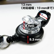 本体:直径φ32.5mm、厚み:約18.5mm、クリップ開口:8mm、二重環:内径12mm 線径1mm、リール紐:約70cm