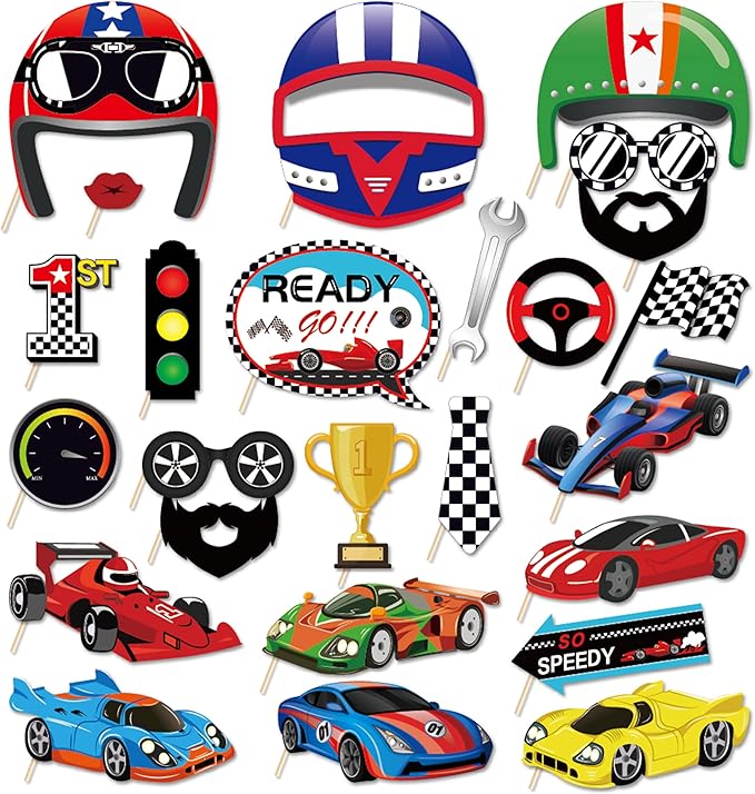 MIKIMIQI 25ピース レースカー パーティー フォトブース用小道具 スティック付き、レーシングカー バースデーパーティーデコレーション セルフィー小道具 男の子 女の子 面白い パーティー 記念品 チェッカーフラッグ トロフィー ヘルメット パーティーデコレーション