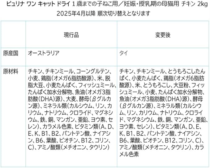 原材料:チキン、チキンミール、コーングルテン、小麦、鶏脂(オメガ6脂肪酸源)、米、脱脂大豆、小麦たんぱく、フィッシュミール、たんぱく加水分解物、魚油(オメガ3脂肪酸(DHA)源)、大麦、酵母(βグルカン源)、ミネラル類(カルシウム、リン、カリウム、ナトリウム、クロライド、マグネシウム、鉄、銅、マンガン、亜鉛、ヨウ素、セレン)、カラメル色素、ビタミン類(A、D、E、K、B1、B2、パントテン酸、ナイアシン、B6、葉酸、ビオチン、B12、コリン、C)、アミノ酸類(メチオニン、タウリン)