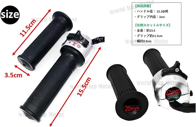 ✅ 右側スロットルサイズ:約全長15.5 グリップ約11.5cm 幅約3.5cm ケーブルの長さ:約45cm ✅ 【ハンドルスイッチの機能】ウインカー・ヘッドライトLow/Hi・ホーンなど
