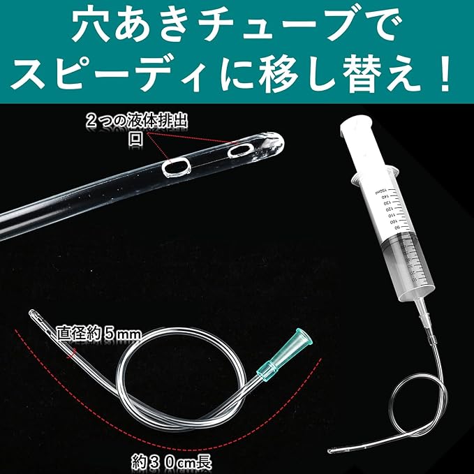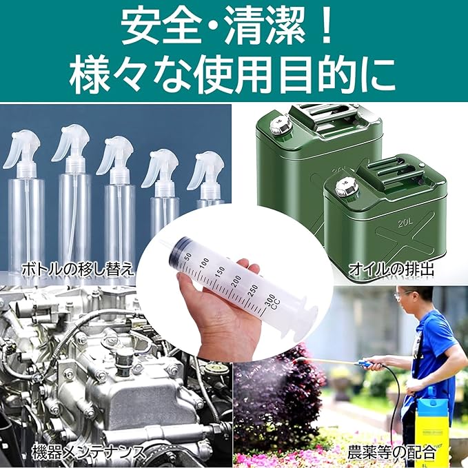 オイルの注入・吸取りや、病気療養中のペットのための水分(水やミルク)、流動食、投薬のための注入器など、様々な使用目的でご利用いただけます。