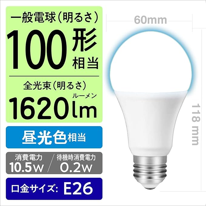 全光束(ランプ単体の明るさ):電球100形相当 1620 lm 、高輝度、約30%省エネ