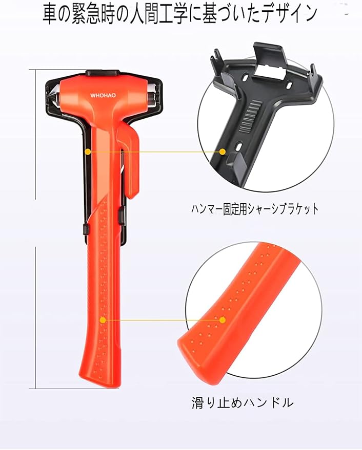 【滑りにくいの設計】緊急脱出ハンマーのハンドルには滑りにくい設計を採用しており、水の中でもきちんとハンマーを滑らずに握ます。緊急状況の時にラクラク車の窓を割ることができます。