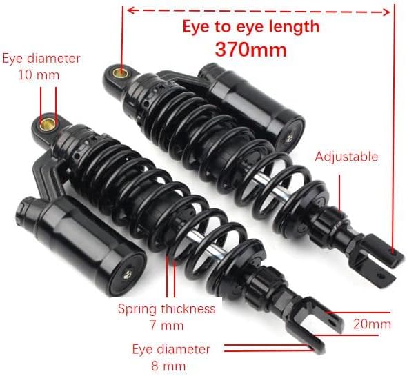 説明:素材。ソリッドスチール+アルミニウム合金。アイ-ツー-アイセンター長さ:370MM。アイの厚さ: 21mm. スプリングの厚さ。7mm。バネの幅: 65mm. 最大積載量。230kg/pair 500lb/pair。ショックアブソーバーは改良型ユニバーサルタイプで、ほとんどのMTBモーターサイクルモトクロスに対応します。購入する前に、取り付け穴の距離を確認してください。mt07アノ2016 FJR 1300 XR250 CBR 125 R Ninja Ex 250 R CBR 1100 Xx Super Blackbird NC750D CBR600RR CBR1000RR CB500 YZF-R1 YZF-R6 YZF-125 XC EXC XCF R800GS R1200GS など、ほとんどの車種にユニバーサルフィットします。このショックアブソーバーのスプリングは調整可能ですが、長さは調整できません。