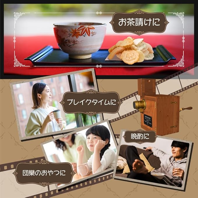 【原材料名】でん粉(国内製造)、植物油、えび、醤油、砂糖、もち米、食塩、水飴 、いか、たこ焼ソース、あおさ、還元水飴 、オキアミ、たこ焼味シーズニング、マヨネーズ味シーズニング、醸造調味料、にんにく味シーズニング、かつお節調味液、たこ、フライドガーリックチップス、昆布エキスパウダー、しょうが酢漬け、たん白加水分解物、ねぎ、昆布、焼きあごエキス、みりん、にんにく、複合削り節粉、でん粉分解物、にんじん / 加工でん粉、調味料(アミノ酸等)、着色料(アナトー、カロチン、カラメル、クチナシ、黄5、赤102、紅麹、赤3、黄4、ウコン)、膨張剤、酸化防止剤(ビタミンE)、甘味料(ステビア)、酸味料、香料、香辛料抽出物、(一部にえび・小麦・卵・乳成分・いか・さば・ゼラチン・大豆・鶏肉・豚肉を含む)