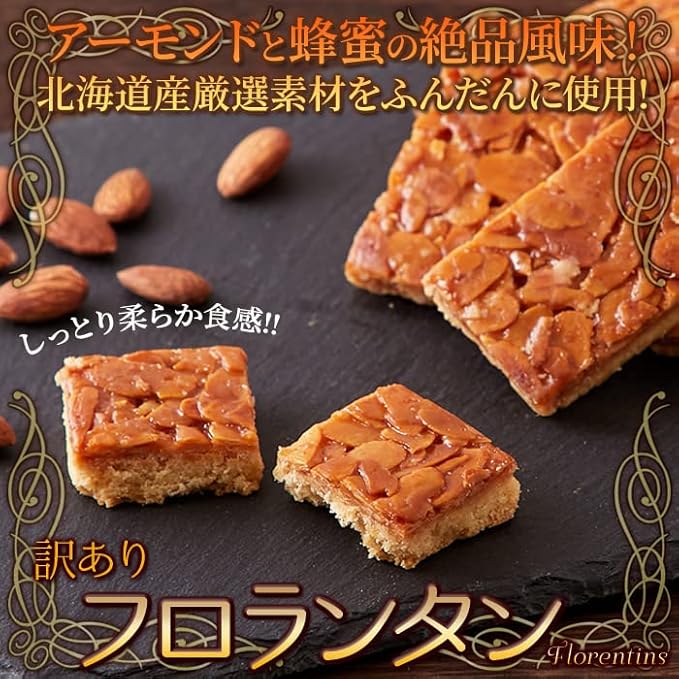 ■商品名:フロランタン ■名称:焼菓子 ■原材料:小麦粉(小麦(北海道産))、マーガリン(乳成分・大豆を含む)、砂糖、アーモンドスライス、蜂蜜、卵、牛乳、アーモンドプードル(アーモンド、コーンスターチ)/乳化剤、香料、酸化防止剤(V.E)、アナトー色素 ■内容量:500g ■賞味期限:製造より常温60日 ■保存方法:直射日光、高温多湿を避け常温で保存してください。 ※開封後は、賞味期限に関わらずお早めにお召し上がりください。 ※本品製造工場ではそば、落花生を含む製品を製造しています。
