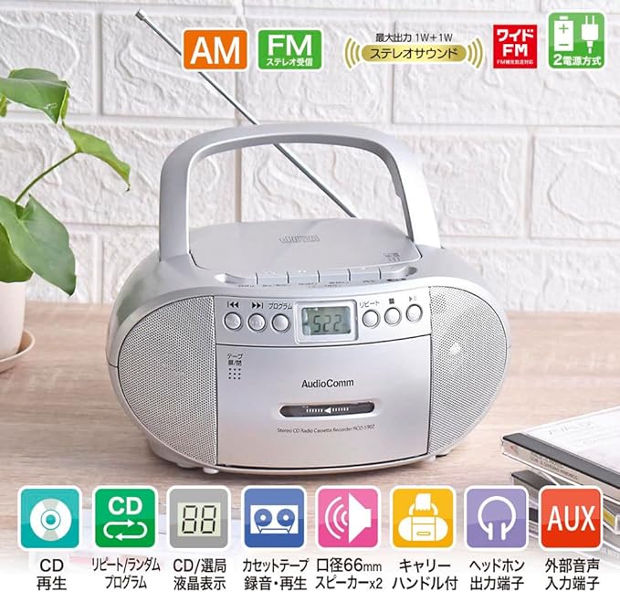 ●懐かしいカセットテープを再生できます。 ●CDやラジオも、カセットテープに簡単に録音できます。 ●外部機器の録音や、外部機器のスピーカーとしても使用可能 ●コンセント、電池の2電源対応(専用電源コード付属、電池別売) ●口径66mmスピーカー2基搭載、最大出力1W+1Wのステレオサウンド ●ワイドFM(FM補完放送)対応 ●CDプログラム(最大20曲まで)・リピート・ランダム再生機能付き ●CD/選局液晶表示 ●ラジオはAM/FM(ステレオ受信)、ワイドFM対応 ●ヘッドホン出力端子、外部音声入力端子付き ●キャリーハンドル付き ●FMロッドアンテナ付き ●本体カラーはシルバー