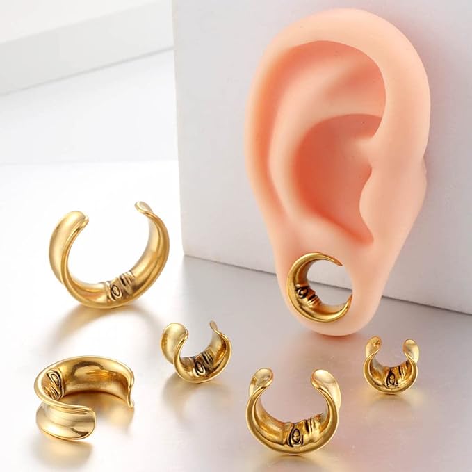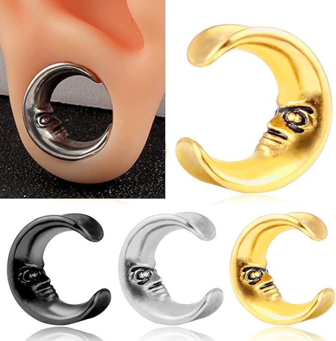 ステンレス製のお伽噺や童話や民話のような顔のデザインした三日月をモチーフにしたオモシロいホール系ボディーピアス。 装着すると耳の内側からお月様の顔が見えて面白いボディピアスです。C型のリアルな三日月型のダブルフレアのようなボディピアスは、丸型よりも切れ目があるので装着しやすい。カラーも黒色ブラック、金色にゴールド、銀色シルバーから選べる男子からも女子からも人気のボディピアス。お友達や親友とオソロで着けてもお洒落なボディピアス。メンズでもレディースでも使えるのでペアルックにもオススメです。ステンレスなので着けっぱなしでもいいのですが、入浴や睡眠時はつけたままにしないで、取り外した方が紛失や商品の品質保持にはいいと思います。 0ゲージ(0G)、00ゲージ(00G))、12mm(半インチ、ハーフインチ)のサイズが通販可能です。