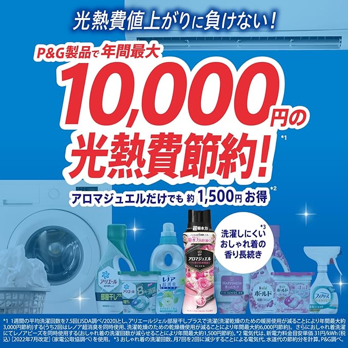 アロマジュエルなら柔軟剤に比べて超吸水*。ドライヤー時間短縮! (*当社柔軟剤比。複数回洗濯後。)