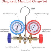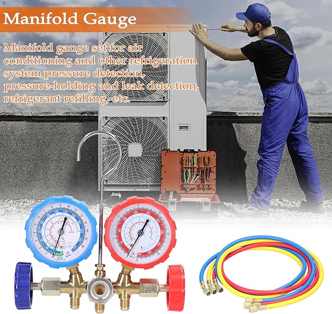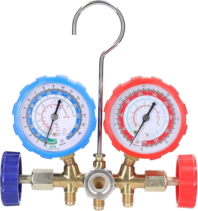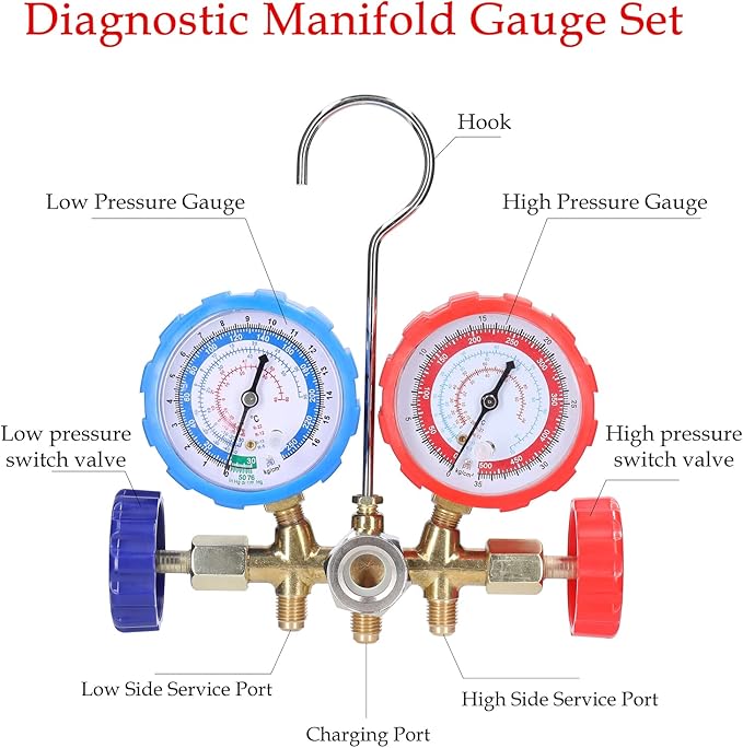 デュアルバルブ 3 ウェイ真鍮圧力計、-30-250PSI 青色低圧ゲージおよび 0-500PSI 赤色高圧ゲージで、明確な目盛りと正確な測定が可能です。