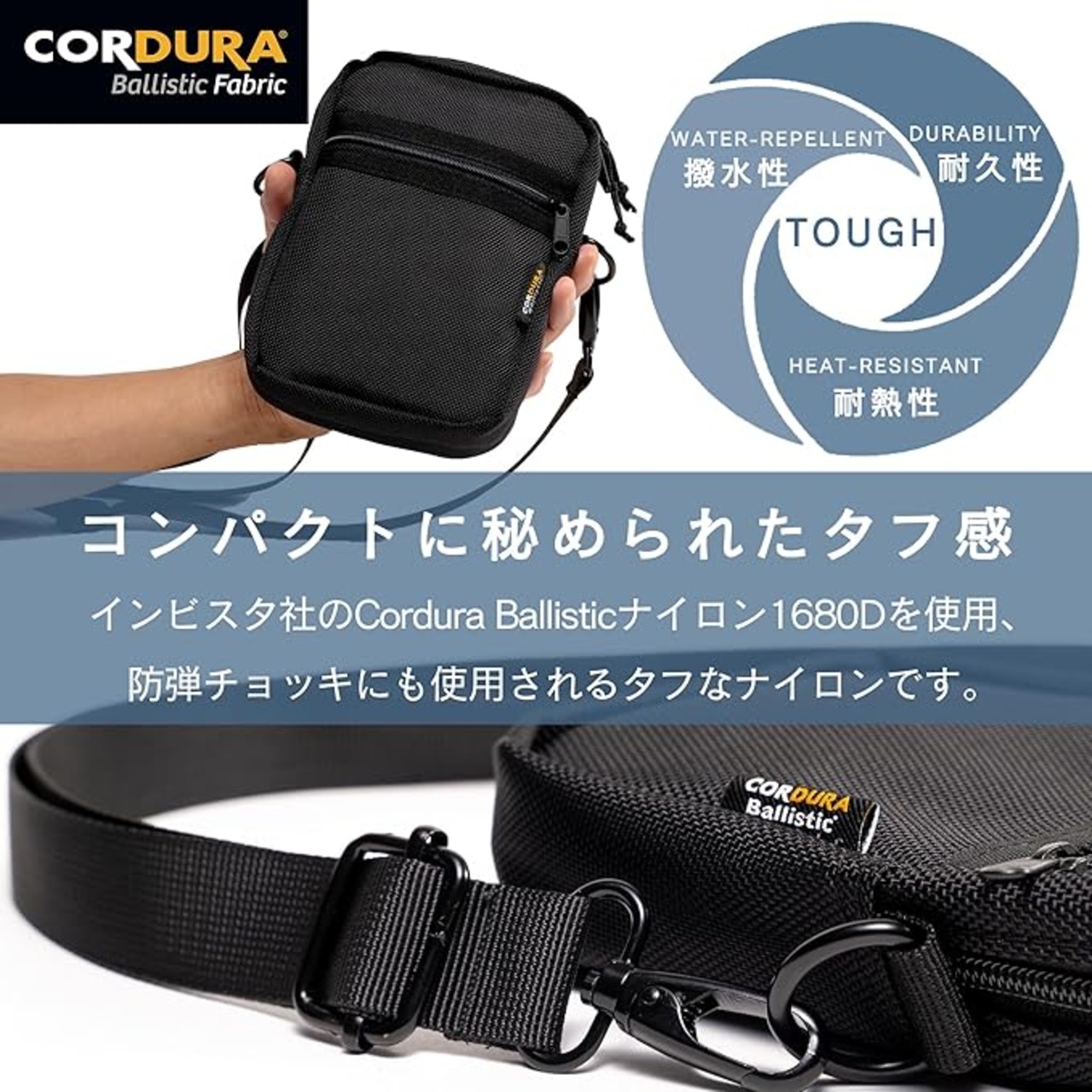 【素材】インビスタ社のCORDURAバリスティックナイロン1680Dを使用したショルダーバッグです。摩擦や引き裂き強度に優れ、軍事用で防弾チョッキにも使用されるタフなナイロンです。頑丈で長くご愛用頂けます。