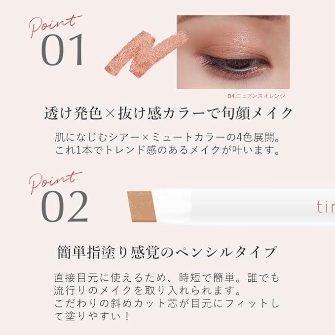 【簡単指塗り感覚のペンシルタイプ】直接目元へ使えるため、時短・簡単・誰でも流行メイクを取り入れられます。小回りが利く斜め芯だから、目頭や涙袋など欲しいところだけに塗れてピタッとフィット。一度塗りで馴染み、重ね塗りで自分好みに濃淡調整も。