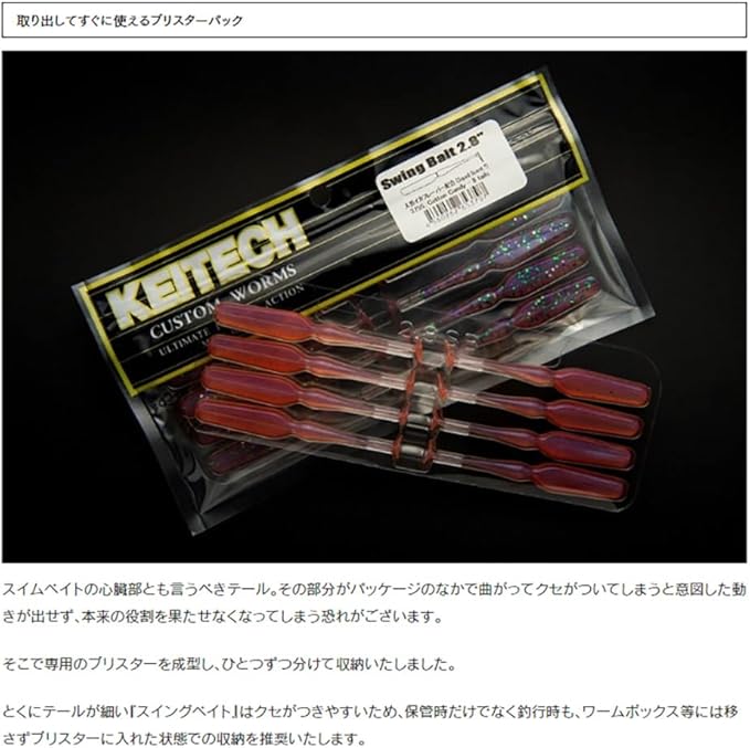 特にテールが細い『スイングベイト』はクセがつきやすいため、保管時だけでなく釣行時も、ワームボックス等には移さずブリスターに入れた状態での収納が可能となります。