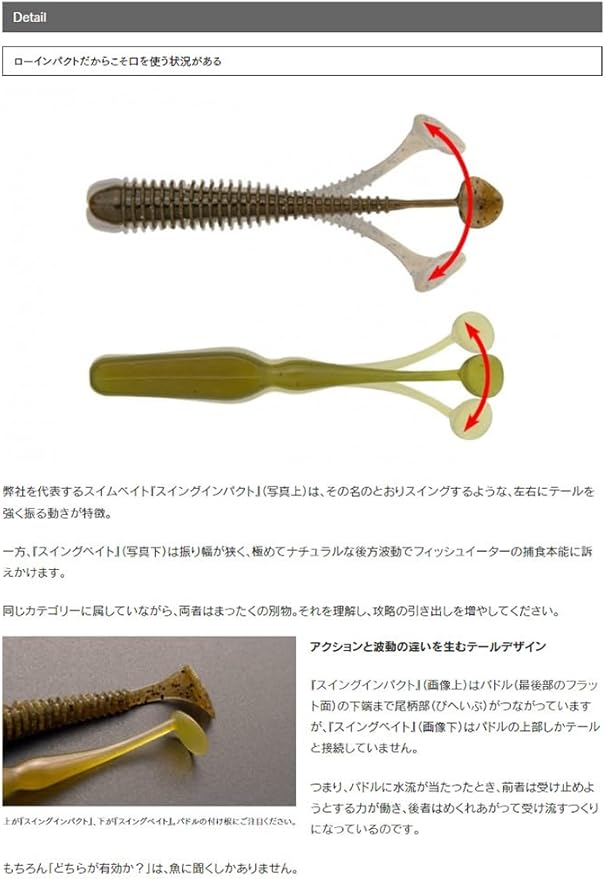 【スイングベイト】は「テールの振り幅が狭く、極めてナチュラルなハイピッチ振動する独特なアクション」を持ちます。