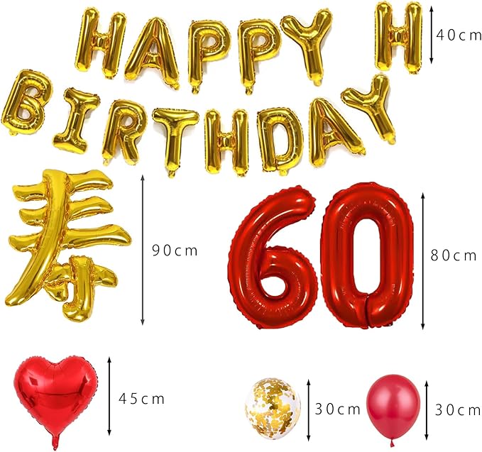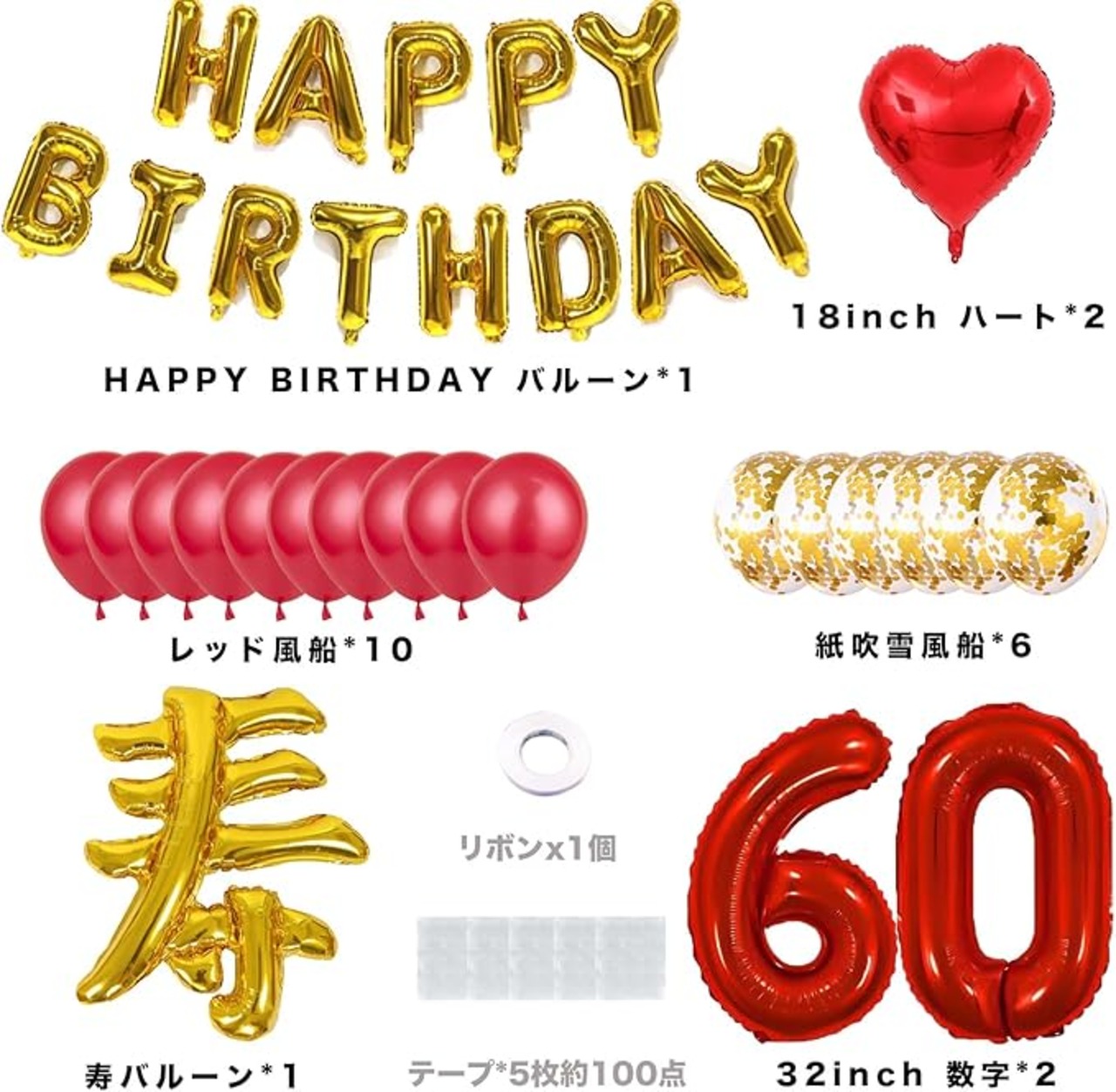 セット内容: BIG寿バルーン(ゴールド)x1(サイズ:約90cm) HAPPY BIRTHDAY(ゴールド)バルーンガーランドx1(文字サイズ:約40cm) 18インチハートバルーン(レッド)x2(サイズ約45cm) 紙吹き風船(金紙いり)x6(サイズ約30cm) レッド風船x10(サイズ約30cm) 60レッド数字バルーンx1(サイズ:約80cm) 付属品:リボンx1 バルーン粘着テープx100点(粘着力弱め)