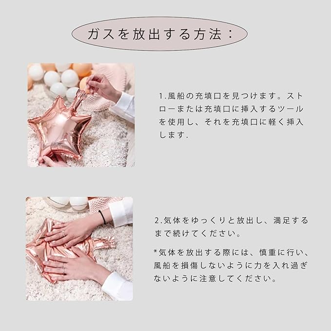バルーンの空気入れ方 (ハンドポンプがあると便利です) 1. ストロー又はハンドポンプを空気穴に差し込みます。 2. ある程度空気が入ったら、軽く押しながら入れます。 3. 空気が全体的にいっぱいになるまで入れすぎ注意破れないように! 4. 出来上がります。