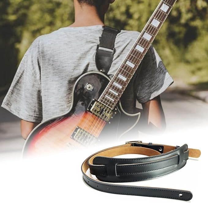 [Frurdiem] 2X 耐久性のある革と金属のバックル電気ギターストラップベルトショルダーパッド調節可能なヴィンテージギターストラップ-ブラックカラー