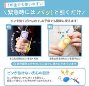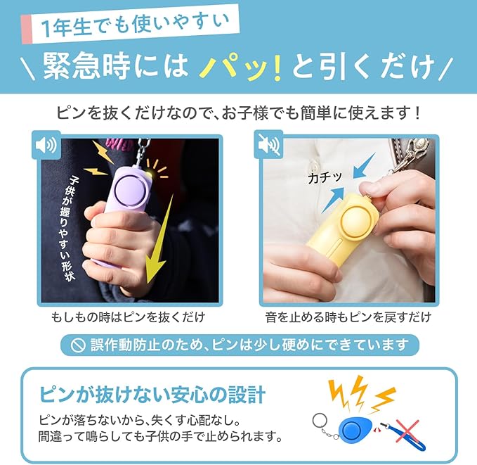 【⚡️ピンが抜けない】ピンは本体から抜け落ちないため「ピンを失くして音を止められない!」という不安がありません。ランドセルに付けていると「ウッカリ」鳴らすことも。止める操作が簡単なので小学生のお子様でも安心です。