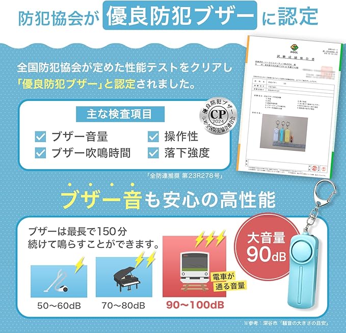 【⚡️引っ張るだけの簡単操作】小学生の手でも握りやすいスリムな形。引っ張るとピンが抜け、90dBの大音量とLEDライト点滅で周囲に危険をお知らせ。ブザー音は150分以上続けて鳴らすことが可能です。誰にでも使えるので大人の女性の防犯対策や、高齢者の見守り、防災グッズとしても使えます。玄関先に置いて、押し入り対策としても。