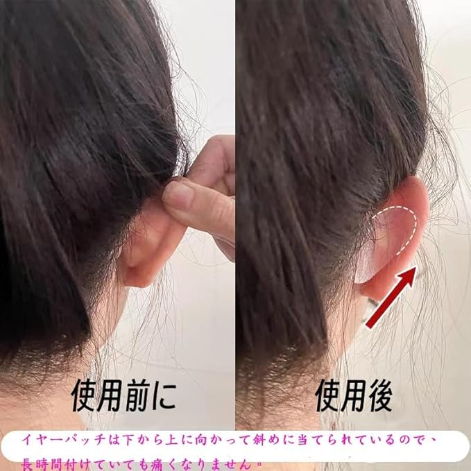 【ステルス耳当て 24枚セット入】小さい耳や左右非対称の耳にお悩みの方へ耳を綺麗に見せるリフトアップテープセットです。イヤリングはパッチを上げ、使用すると顔が小さく見え、頬骨の外広がりを視覚的に弱めます。貼る角度を変えれば、耳の立ち具合もお好みに合わせて調整ができます。
