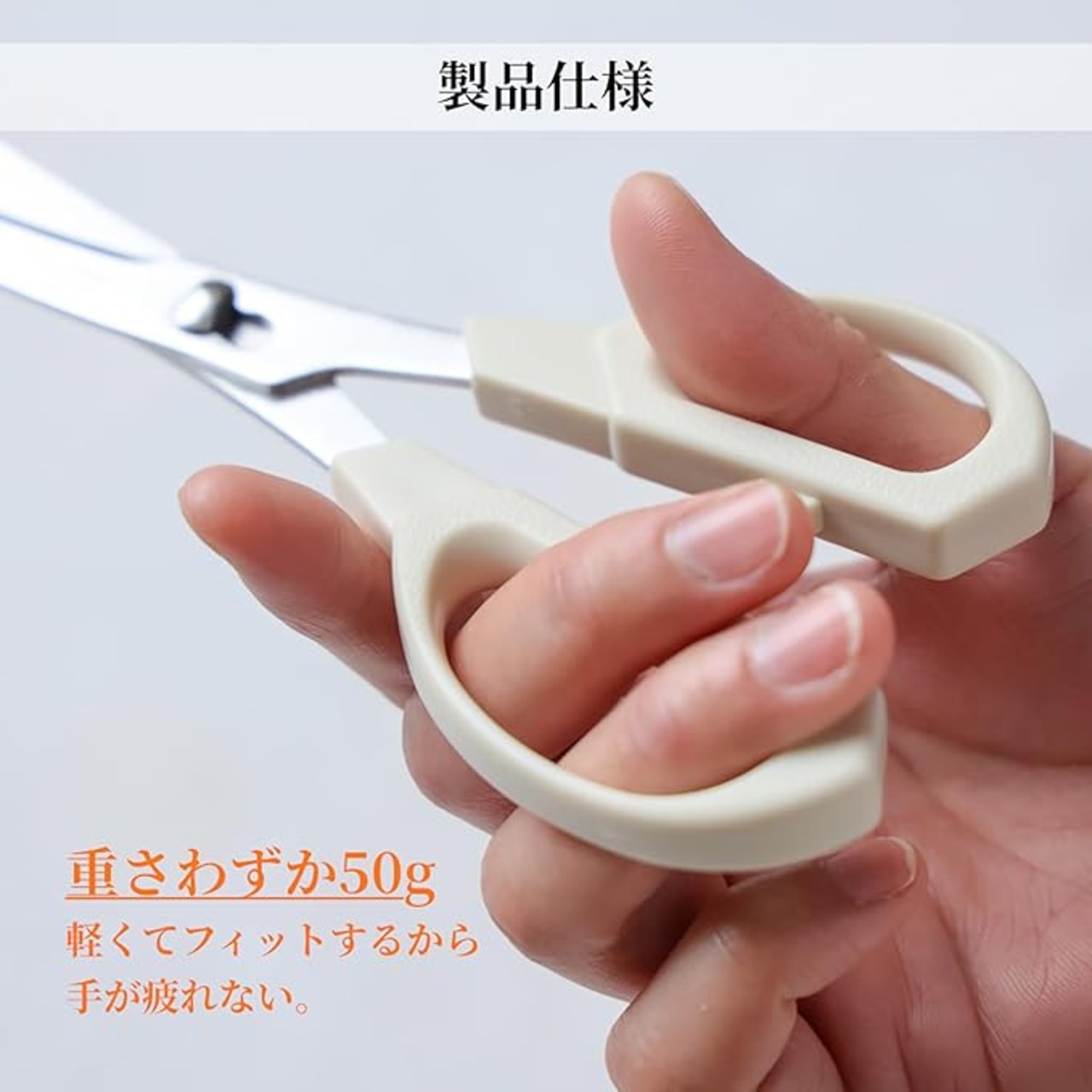【刃渡りは一般的なキッチンバサミと同じ。軽量・コンパクト設計】全体のサイズはコンパクトでありながら、実は刃渡りは一般的なキッチンバサミと同等。出番が少ない機能を削ぎ落し、本当に良く使う「ハサミ」に特化しました。わずか50gと軽く、コンパクトだから手にフィットして疲れにくく、小回りが利いて扱いやすいのも大きな特徴です。特徴的なカーブ刃でスッと食材に入り込み、更には先はギザ刃だから食材を逃がしません。タコや鶏肉などの滑りやすく柔らかい食材から、カニや昆布などの堅い食材までスムーズにカットできます。