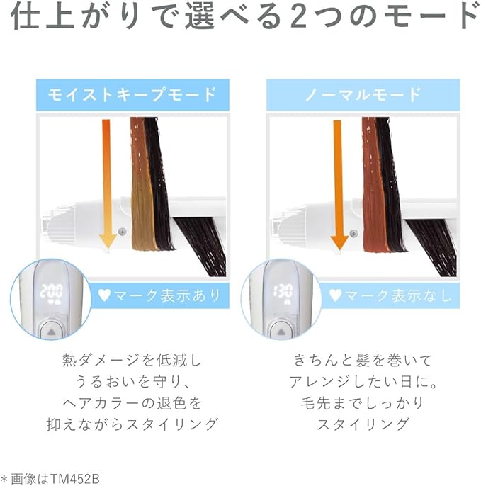 スチームにより毛束の内側まで熱が伝わりやすくなり、クセづけ力が約116.7%にアップ。※クセがつきにくい方や、手早くクセをつけたい方におすすめです。 ※当社調べ。 /IPM1832にて検証。160℃以上の高温に設定した場合の効果。/使用環境(温度・湿度・季節など)や個人差で効果は異なります。 /モイストキープモードとの併用はできません。