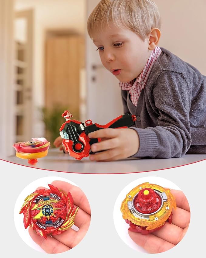 【 ベイバトルトップ x 1、ベイランチャーLRとグリップ x 1、ステッカー x 1。 画像をご参照ください。 新しくアップグレードされたランチャーとハンドルにより、ジャイロパワーがより豊富になり、子供が戦っているときの操作がより便利になります。
