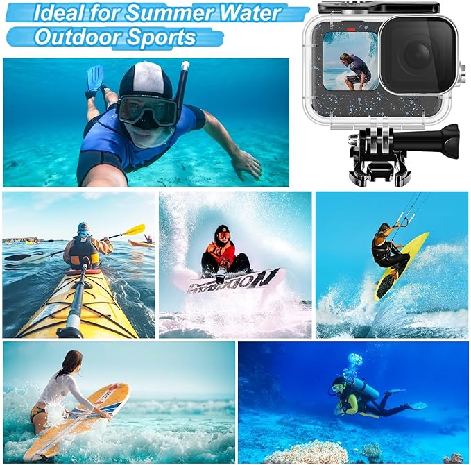 【水中アクセサリーキット】GoPro Hero 12/11/10/9用に特別に設計されたアクセサリーキットは、水泳、サーフィン、ダイビング、シュノーケリング、ドリフト、スキューバダイビング、カヤック、ウォータースケートボード、水中写真撮影中に万能の保護を提供します。 このキットにより、ウォータースポーツ活動やパラシュート、バンジージャンプなどのエクストリームスポーツ中にPOV/Vlog撮影をしながら、カメラを保護して安全に保ちます。