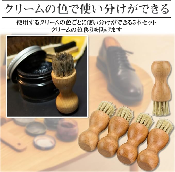 クリームの成分や色味ごとに使い分けられるようブラシを5本セットでご用意致しました。靴・財布・キーケース・カバン・ソファなどあらゆる革製品のメンテナンスにお役立てください。