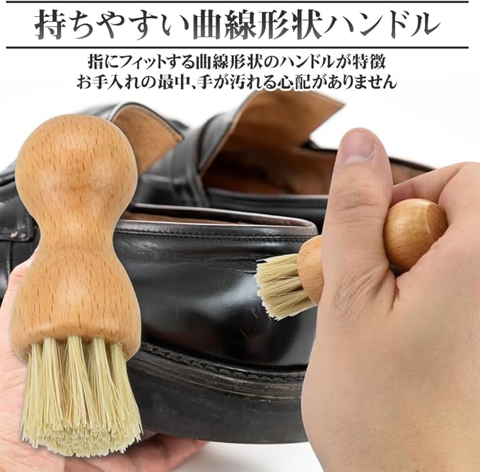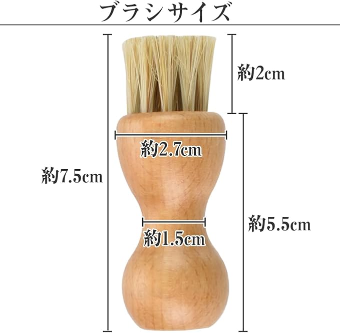 クロスやスポンジとは異なり持ち手があるため手を汚さずに革製品のお手入れができるブラシです。中央がくびれた形状により、指を添えやすく安定した状態でお使いいただけます。