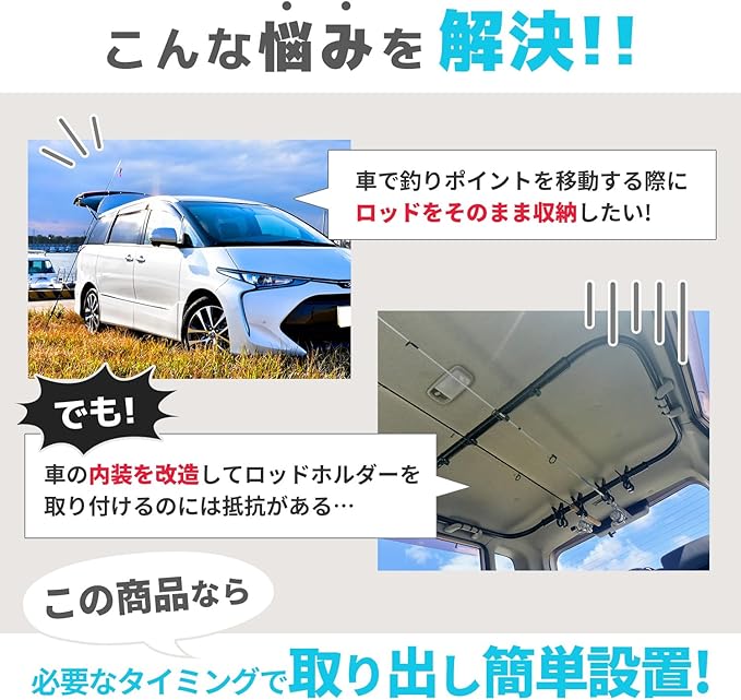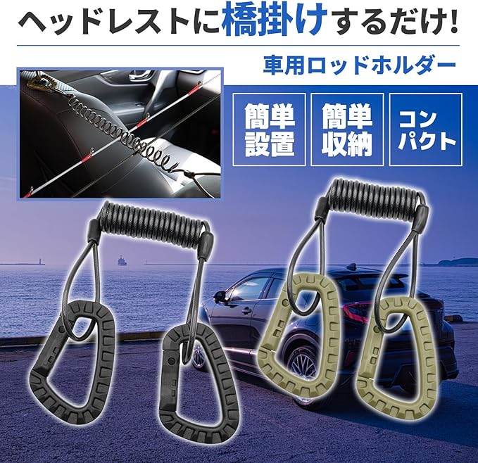 車のヘッドレストやアシストグリップに取り付けることで車載ロッドホルダーに早変わり!車用簡単取付ロッドホルダーになります。【簡単取付・収納】軽量コンパクト設計の為普段の運転時はアームレストなどに収納、釣りに行くときにサッと取り出し取付できるので車を日常とフィッシングで使い分けが可能になります。【ランガンにオススメ】釣りポイントを車ごと移動したいことは多々あると思います。このロッドスタンドを使用することで釣り竿を分解することなくそのまま車に取り込めるので快適な釣りをアシストします。【カール構造】ワイヤーのカール構造が運転中にロッド(釣り竿)が遊ばないよう固定!ロッド同士のぶつかりを保護するとともに、間隔を多く取ってあげることで自宅セットしてきた仕掛けの絡まりも防ぎます。【アレンジ自由】カラビナ固定だけの簡単設置なのでヘッドレストやアシストグリップ(天井設置)に限らず取り付け可能。ブラックカラーとグリーンカラーの2色をご用意していますので車内や釣り具に合わせてオリジナルのカスタムをお楽しみください。