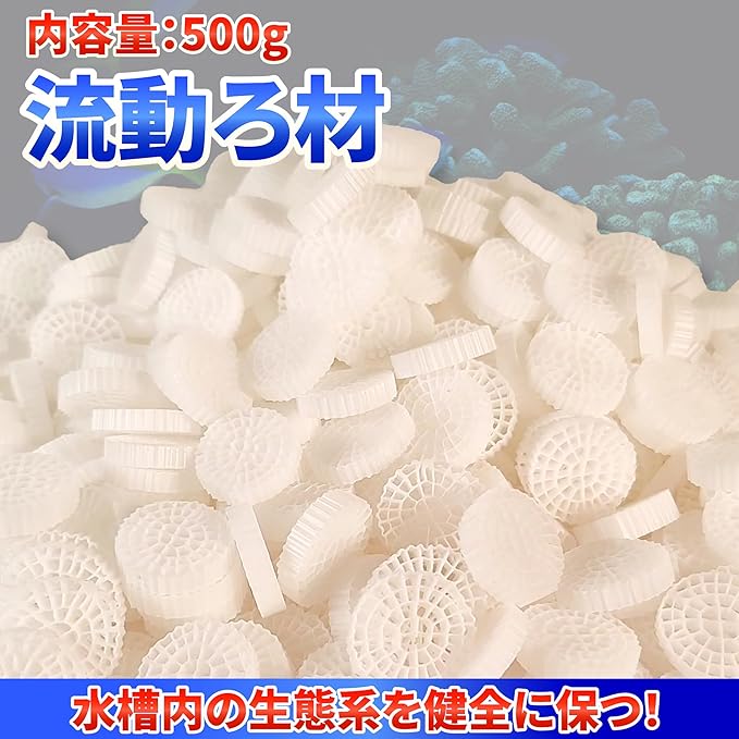 不純物の除去 : 水槽内に魚の排泄物、餌の残り、その他の有機物が蓄積すると、水質が悪化し、有害なアンモニアや亜硝酸塩のレベルが上昇します。流動ろ材は、これらの不純物を物理的に捕捉し、取り除くことで水質を改善します。