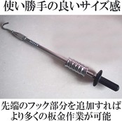 【使い勝手の良いサイズ感】手持ちのハンマー部分には凹凸がありグリップし易い設計ですので、しっかりハンマーショックを伝える事が出来ます。また先端のフック部分を追加すればより多くの板金作業にご利用頂けます。