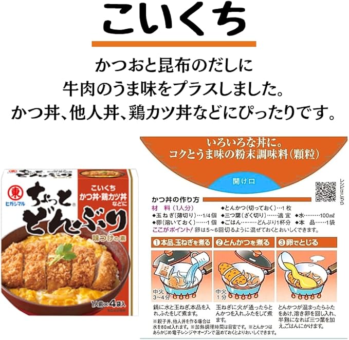 とんかつや玉ねぎをさっと煮込んで玉子でとじるだけで、手軽にどんぶりが作れる粉末調味料です。