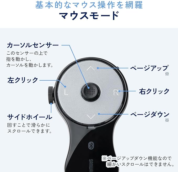 中央の スティック を傾けることでカーソルがスムーズに動きます。新しく ホイール が追加となり、スムーズな スクロール が可能になりました。