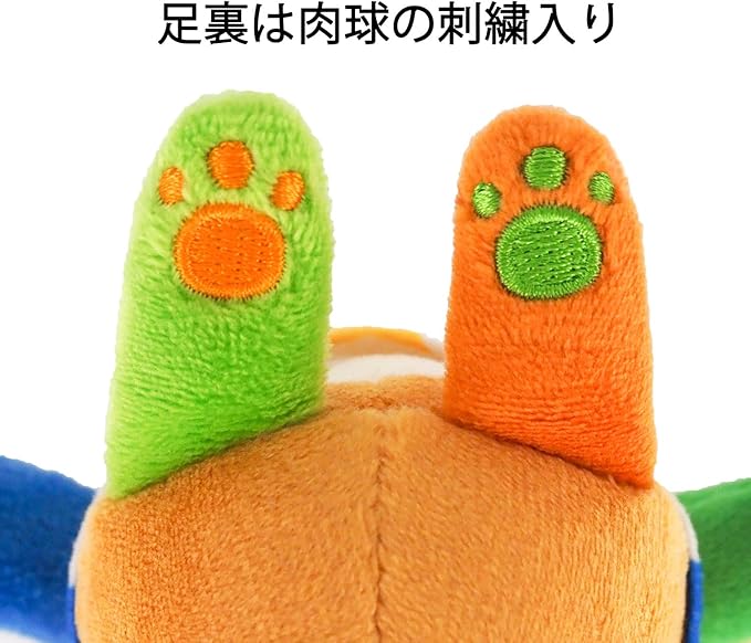 『どうぶつの森』に登場する「パッチ」のぬいぐるみ。頭と両サイドにステッチが入っており、足裏に肉球もあります。