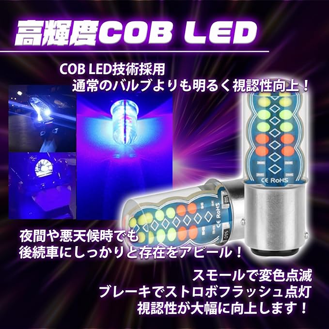 【高輝度COB LED】このテールバルブは、COB LED技術を採用しており、通常のバルブよりも明るく、視認性が向上します。夜間や悪天候時でも、後続車にしっかりと存在をアピールでききます。スモールで変色点滅、ブレーキでストロボフラッシュ点灯視認性が大幅に向上します。