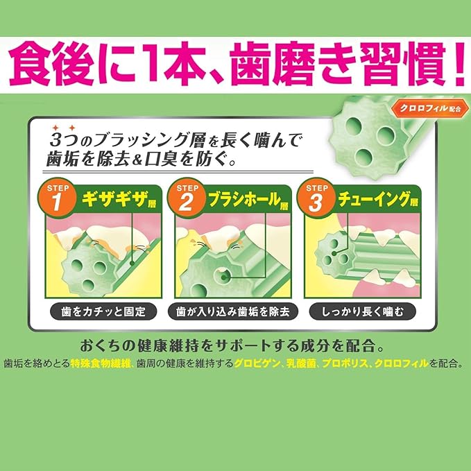 ●歯垢を絡めとる特殊食物繊維、歯周の健康を維持するグロビゲン、乳酸菌、プロポリス、クロロフィルを配合。超小型・小型犬向けサイズ。