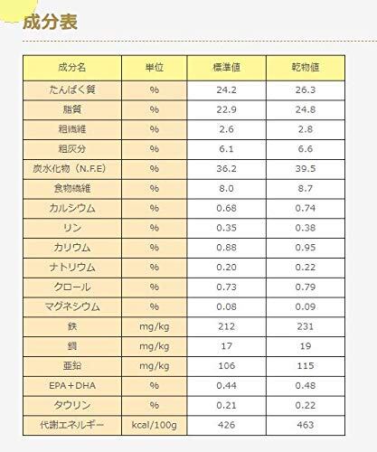 製品中のたんぱく質含有量を制限しています。(標準値:24.2%) 製品中のリン含有量を制限しています。(標準値:0.35%) ナトリウムを低減しています。(EPA・DHA)を配合しました。 腸内で発生する窒素性老廃物に配慮して、栄養学的にフラクトオリゴ糖を配合しました。