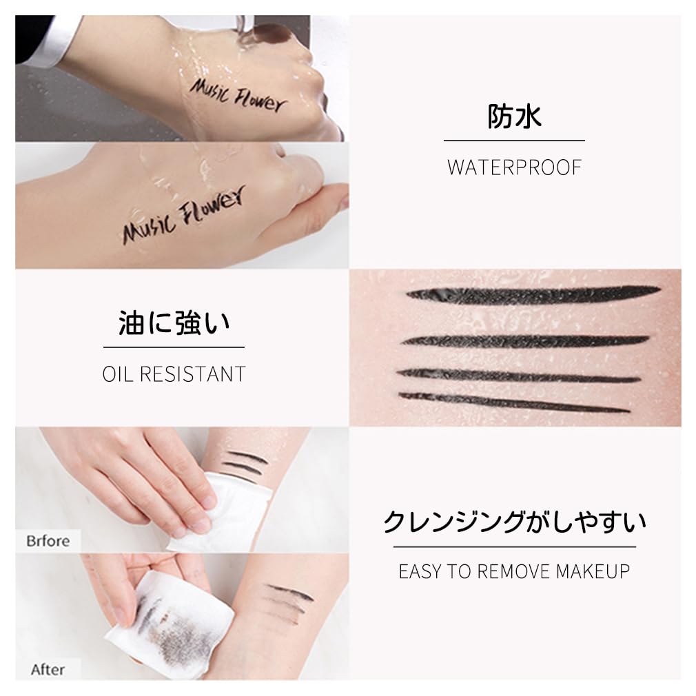 【速乾性と持続性を両立】長時間持続する防水性と汚れ防止効果を備えたこのアイライナーは、メイク落としで簡単に落とせるため、一日中快適に使用できます。速乾性に優れ、発色も長持ちします。