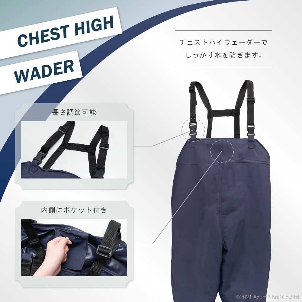 ■サイズ:[本体] (約)143cm(肩バンド含まず) [胴回り] (約)130cm [又下] (約)90cm [靴サイズ] (約)28cm (※バンド調整で肩高最大170cm程度まで対応しております。) ■装備:ポケット×1 ■付属品:補修用パッチ、接着剤 <注意事項> ※本製品の限界を超えた水位でのご使用はご遠慮下さい。 ※本製品内部に浸水し、怪我や水難事故の原因になります。 ※深い場所での作業には必ずライフジャケットをご着用下さい。 ※本製品表面を傷つけないで下さい。破損し、浸水の原因になります。 <必ずお読み下さい> ※商品はモニターによって色合いが異なって見える場合があります。 ※その他(重要) 海外生産。